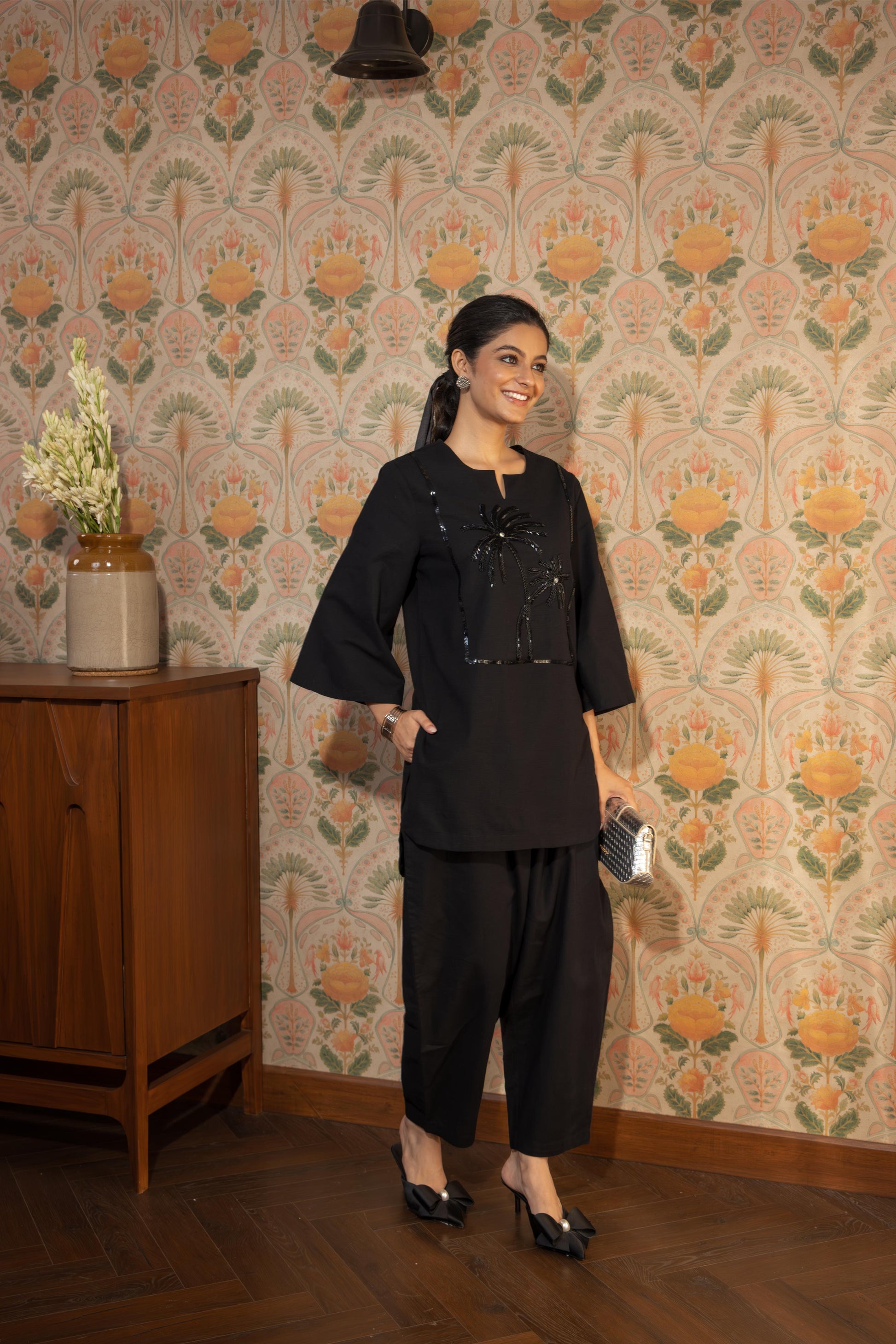 Infuse handcrafted artistry into your wardrobe with this elegant co-ord set. The striped tunic is beautifully adorned with a Palm tree design created in Nalki hand embroidery work, adding a unique statement detail to the piece. Featuring a round neckline with slit opening, three-quarter sleeves, and a relaxed silhouette, it ensures effortless comfort with style. Paired with draped easy-fit pants, this set strikes the perfect balance of traditional handcraft and modern tailoring — ideal for casual outings, festive wear, or relaxed travel dressing.