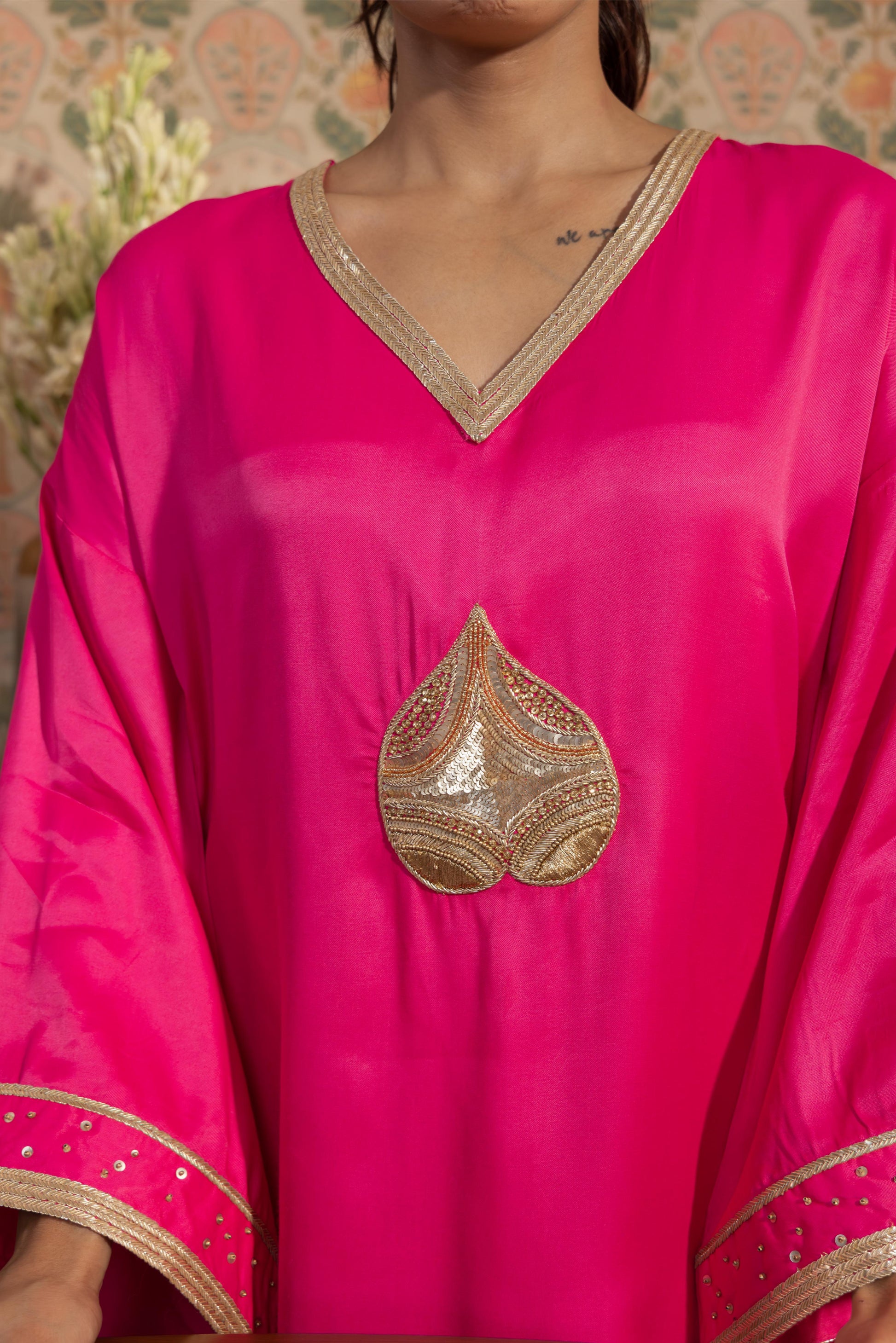 This graceful kurta and pant set is crafted to combine elegance with ease. The relaxed-fit kurta features a subtle embroidered motif at the front, along with delicate detailing on the neckline and sleeve edges, adding a refined touch without overpowering the design. The flowing silhouette and side slits enhance movement and comfort, making it suitable for festive gatherings, casual outings, or formal occasions. The coordinating pant completes the look, offering a balanced and effortless style.