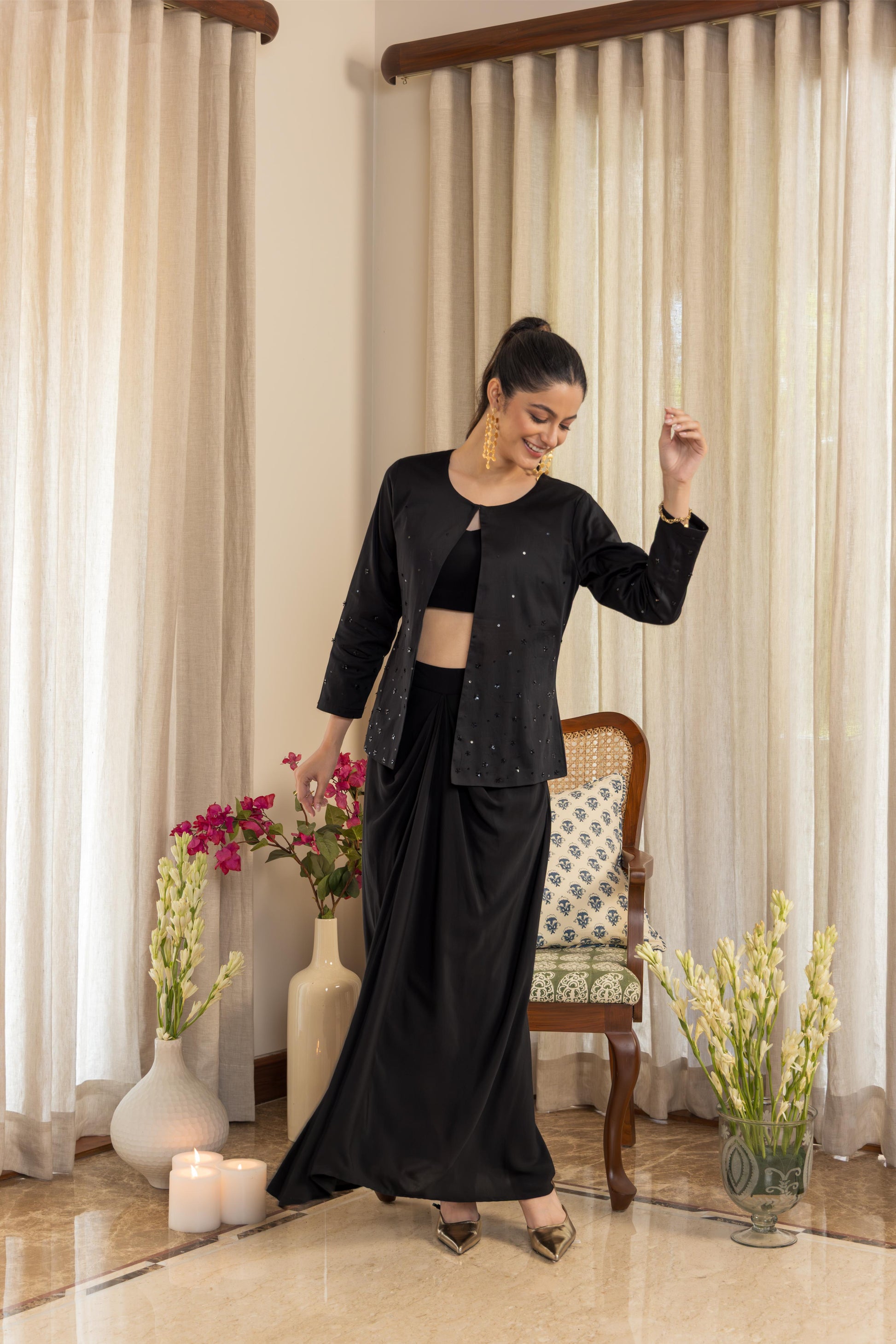 A contemporary three-piece set crafted for statement-making elegance. The outfit features a sleek cropped blouse with clean lines, paired with a fluid draped skirt that adds movement and sophistication. Layered with a matching jacket adorned with delicate sequin embroidery on the sleeves, this ensemble strikes the perfect balance between minimal design and festive sparkle. Versatile enough to wear together as a coordinated set or styled separately, it’s your go-to for cocktail evenings, weddings, or celebratory occasions.