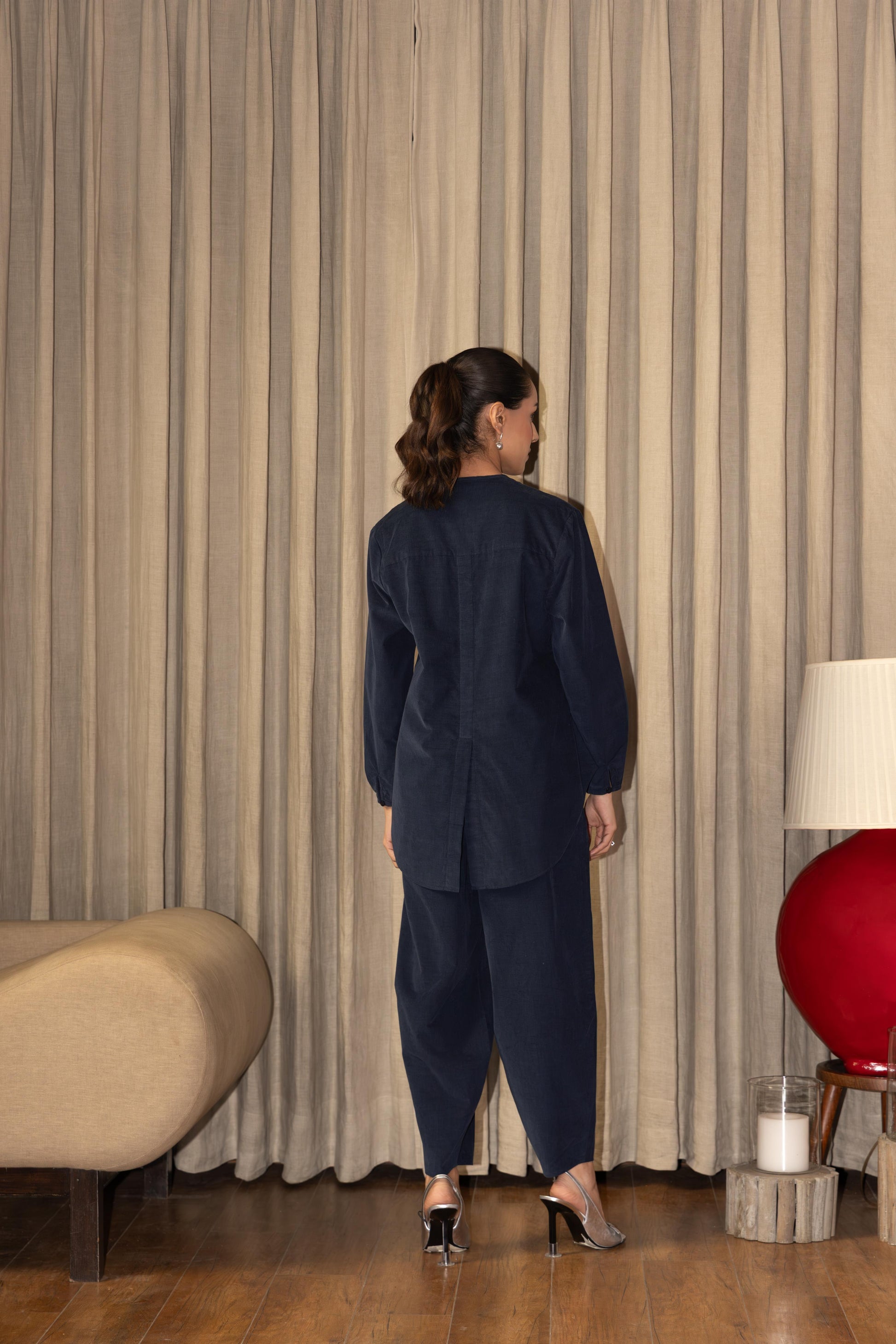 The bottoms are tailored with soft pleats and a comfortable waistband, designed to provide ease of movement while maintaining a polished fit. Together, the set creates a harmonious balance of modern simplicity and refined craftsmanship — ideal for the confident, empowered woman.