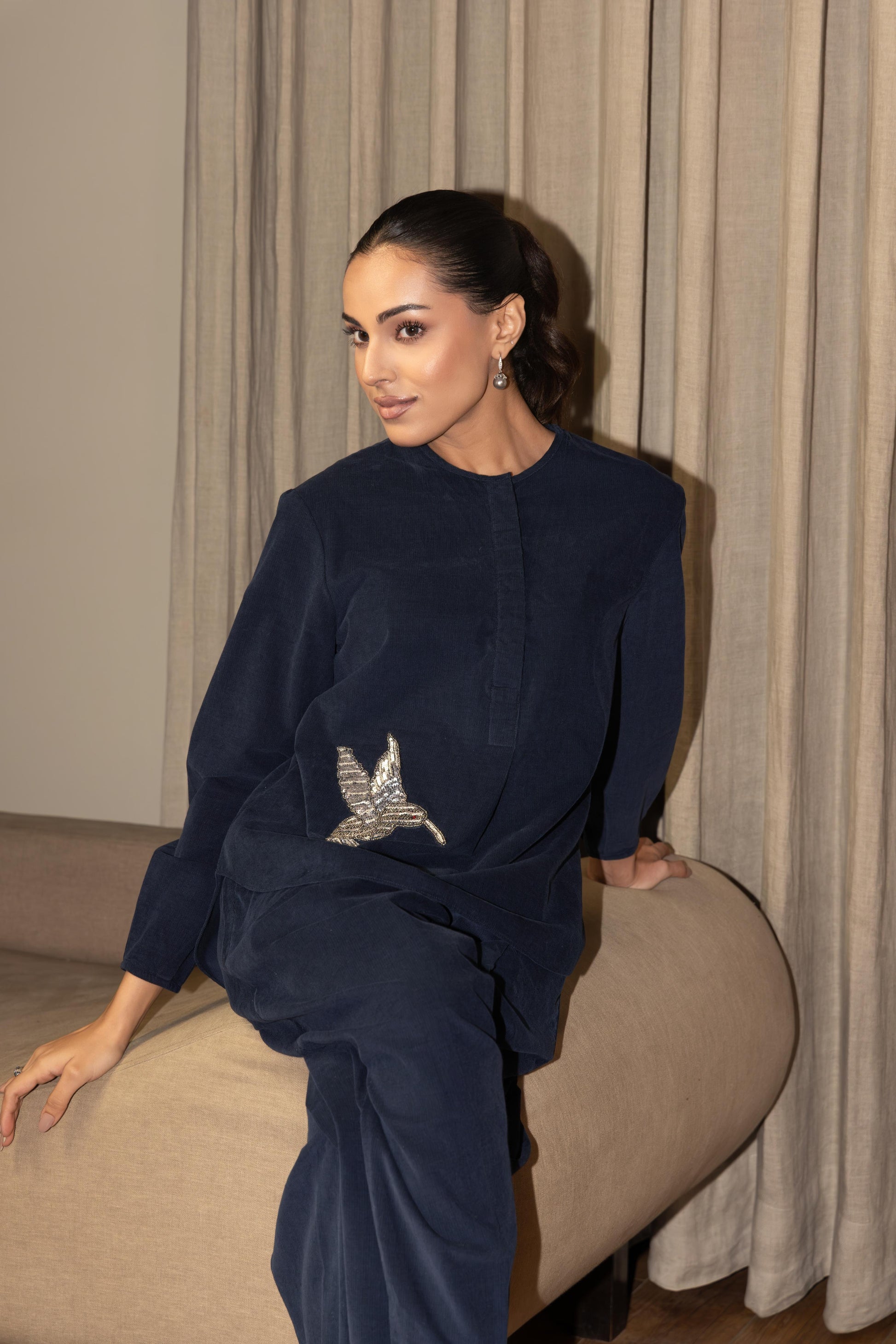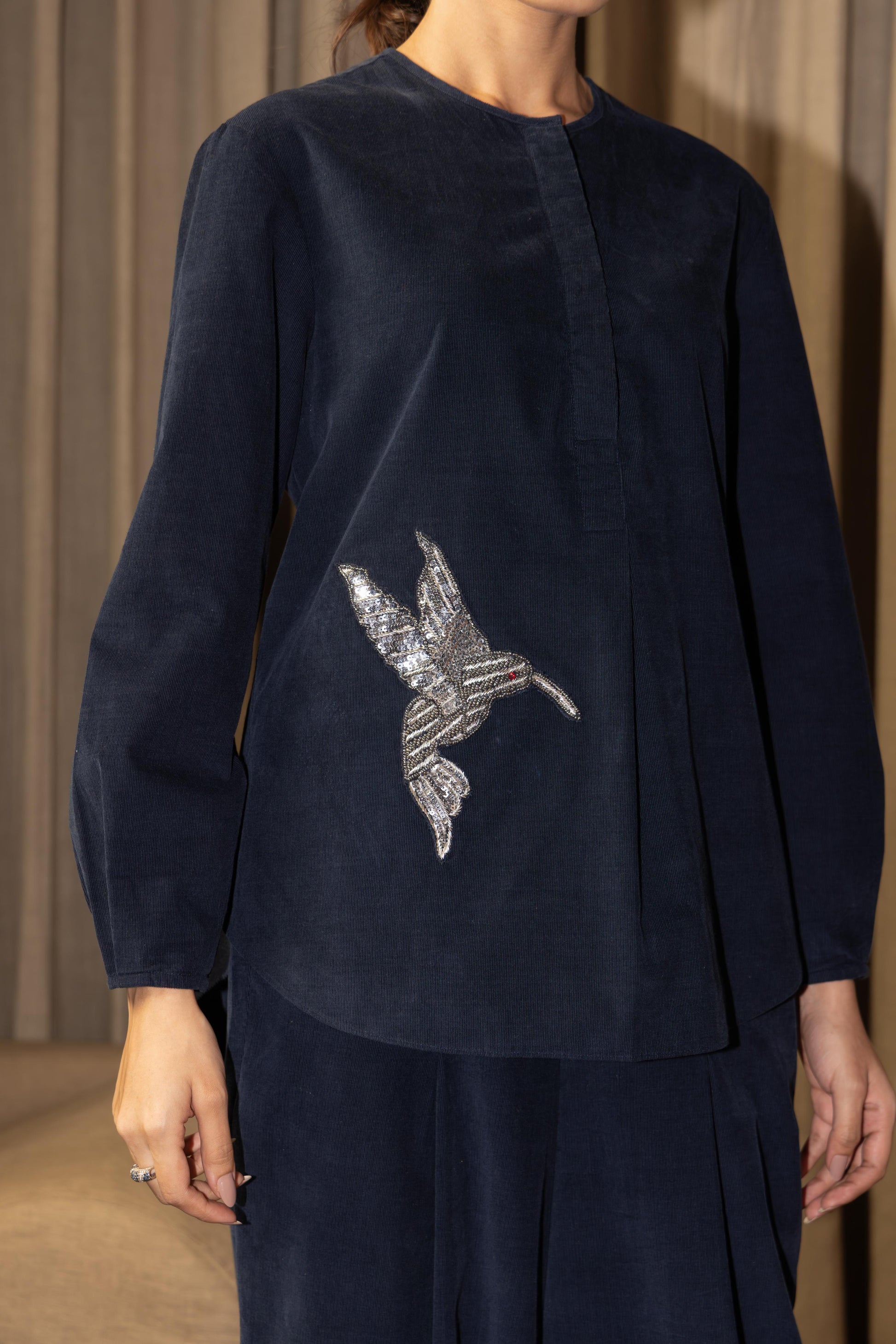 The top features a relaxed silhouette with a mandarin collar and a concealed front placket, creating a sleek, minimalistic look. The highlight is the hand-embroidered bird motif, delicately placed to add a touch of artistry and individuality. Full sleeves enhance the graceful fall of the garment, giving it an elegant and composed appeal.