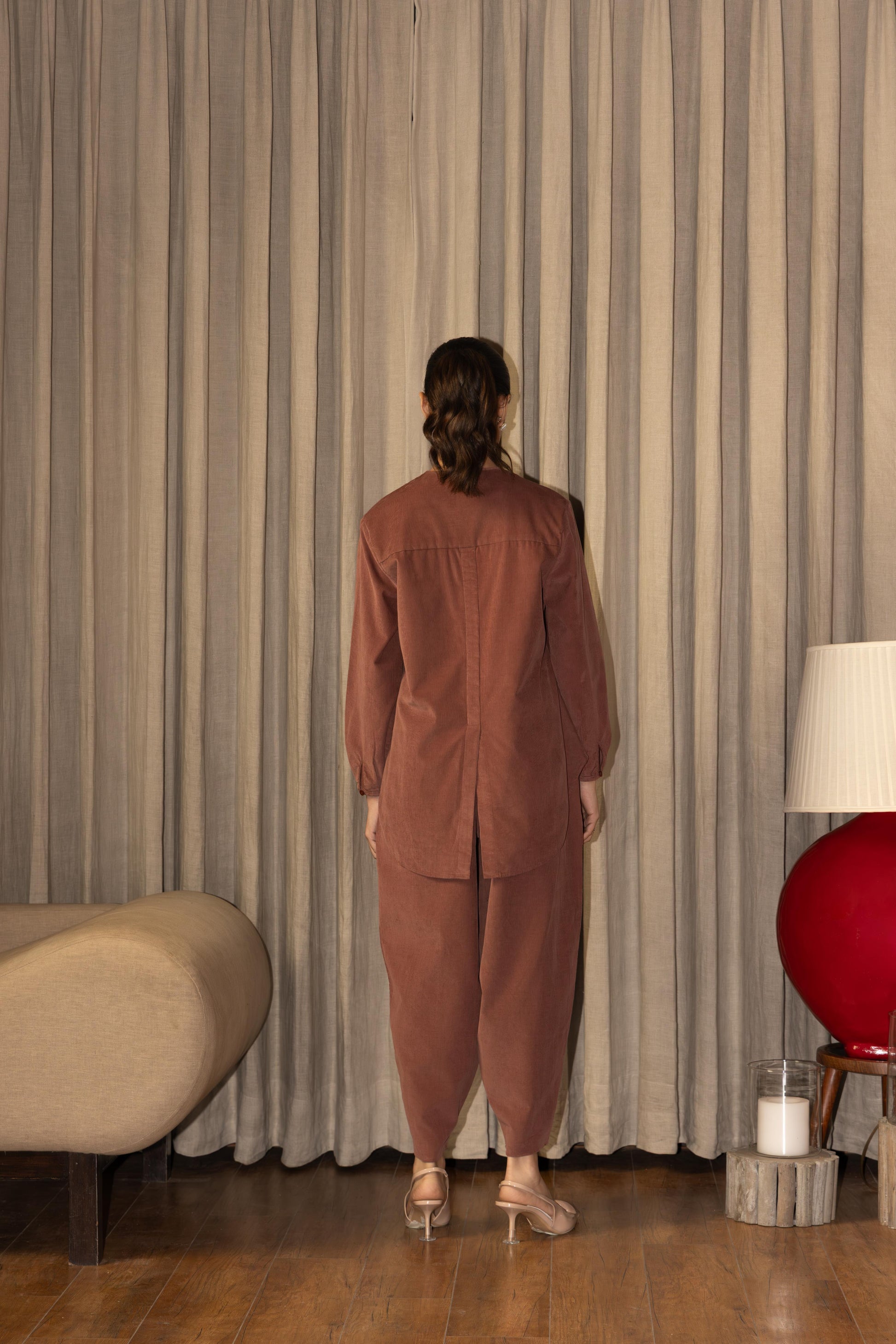 Graceful, minimal, and elevated — this embroidered corduroy co-ord set celebrates the beauty of handcrafted artistry blended with everyday sophistication. Made from 100% natural cotton corduroy, the fabric offers a soft, velvety texture with a structured drape, ensuring both comfort and a luxurious feel.