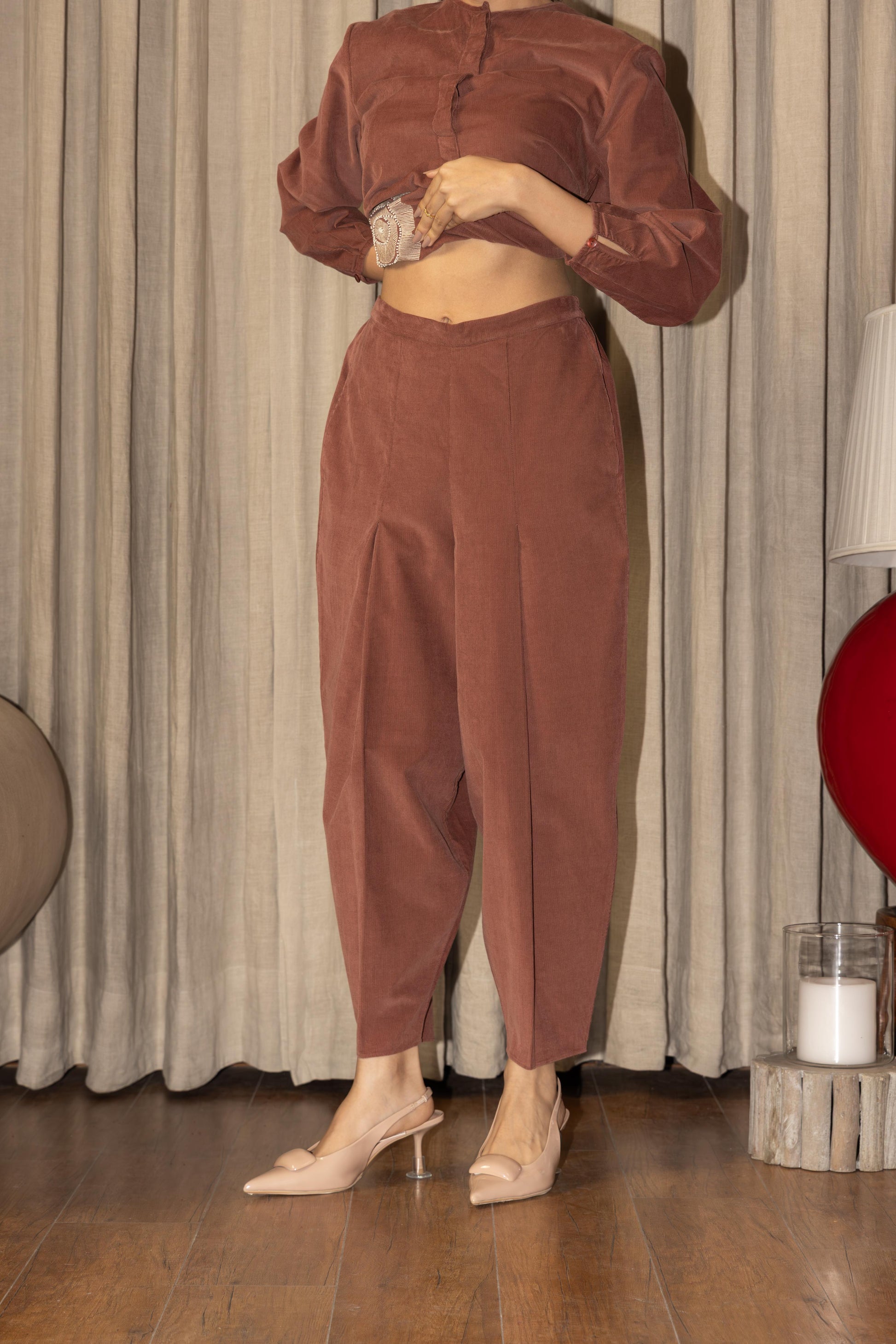 The bottoms are designed with a tapered fit and subtle pleats, offering ease of movement without compromising structure. The set exudes understated luxury — perfect for the woman who values craftsmanship, comfort, and modern elegance in her wardrobe.