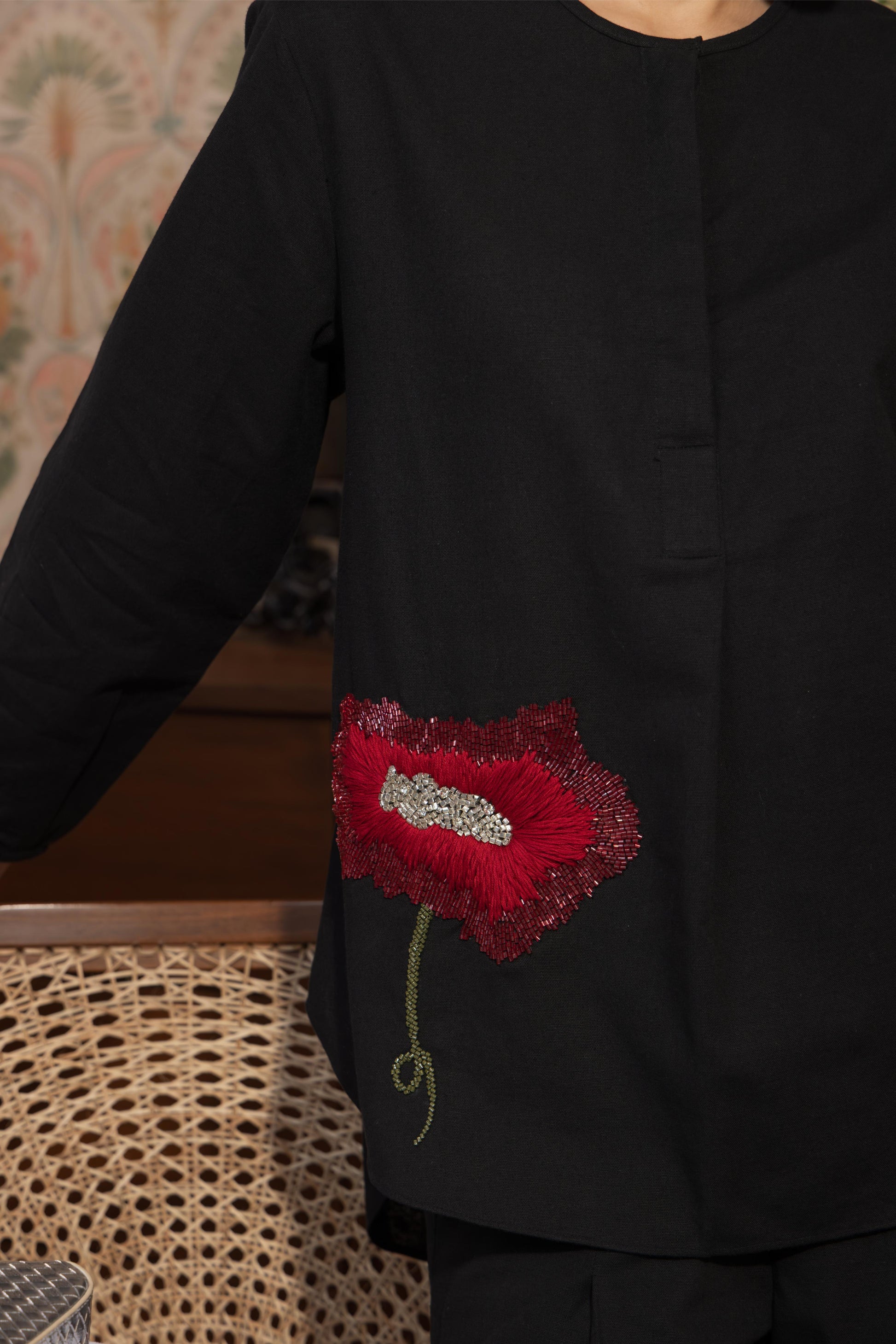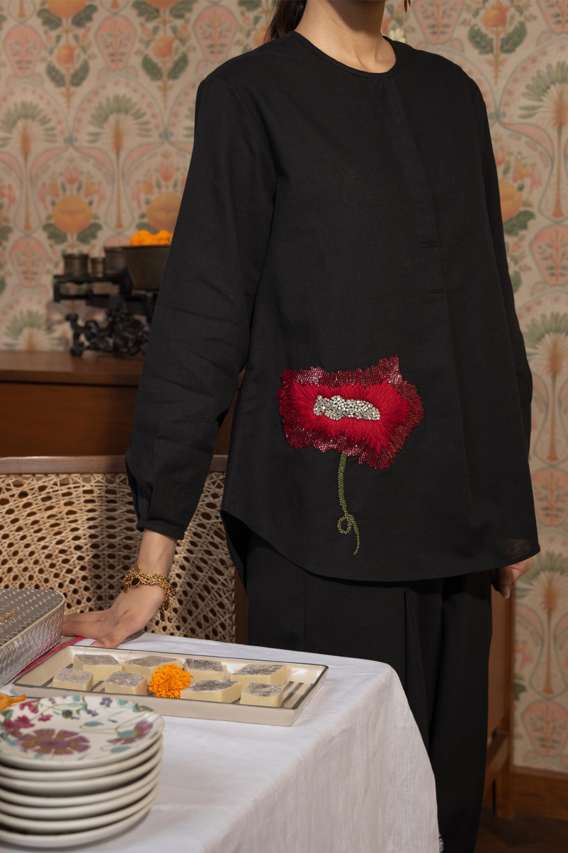 A modern cord set that celebrates minimalism with a touch of bold expression. The shirt is crafted with a round neckline, concealed button placket, and relaxed tailoring, making it a timeless piece for everyday wear. A striking hand-embroidered floral motif placed thoughtfully on the side transforms the look into an artistic statement. The straight trousers carry a clean, tailored cut, balancing ease with sophistication. Perfect for both effortless daywear and elevated evening dressing, this set embodies comfort, style, and individuality.