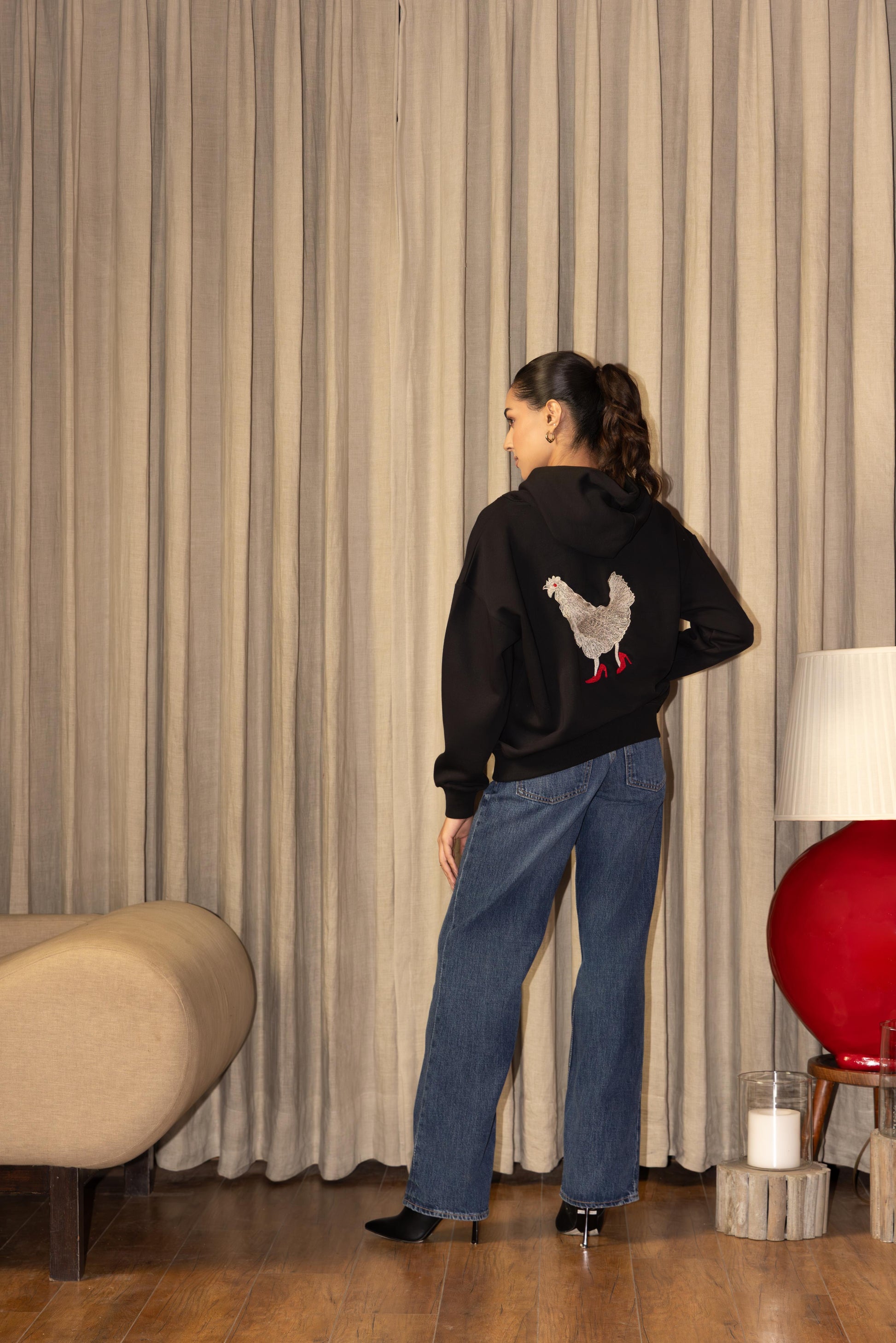 Playful yet powerful — this hoodie redefines casualwear with a touch of bold individuality. Featuring an intricately embroidered hen motif at the back, it’s a tribute to confidence, charm, and a free-spirited attitude. The contrast of detailed embroidery and minimal design makes it a standout piece for effortless, expressive style.