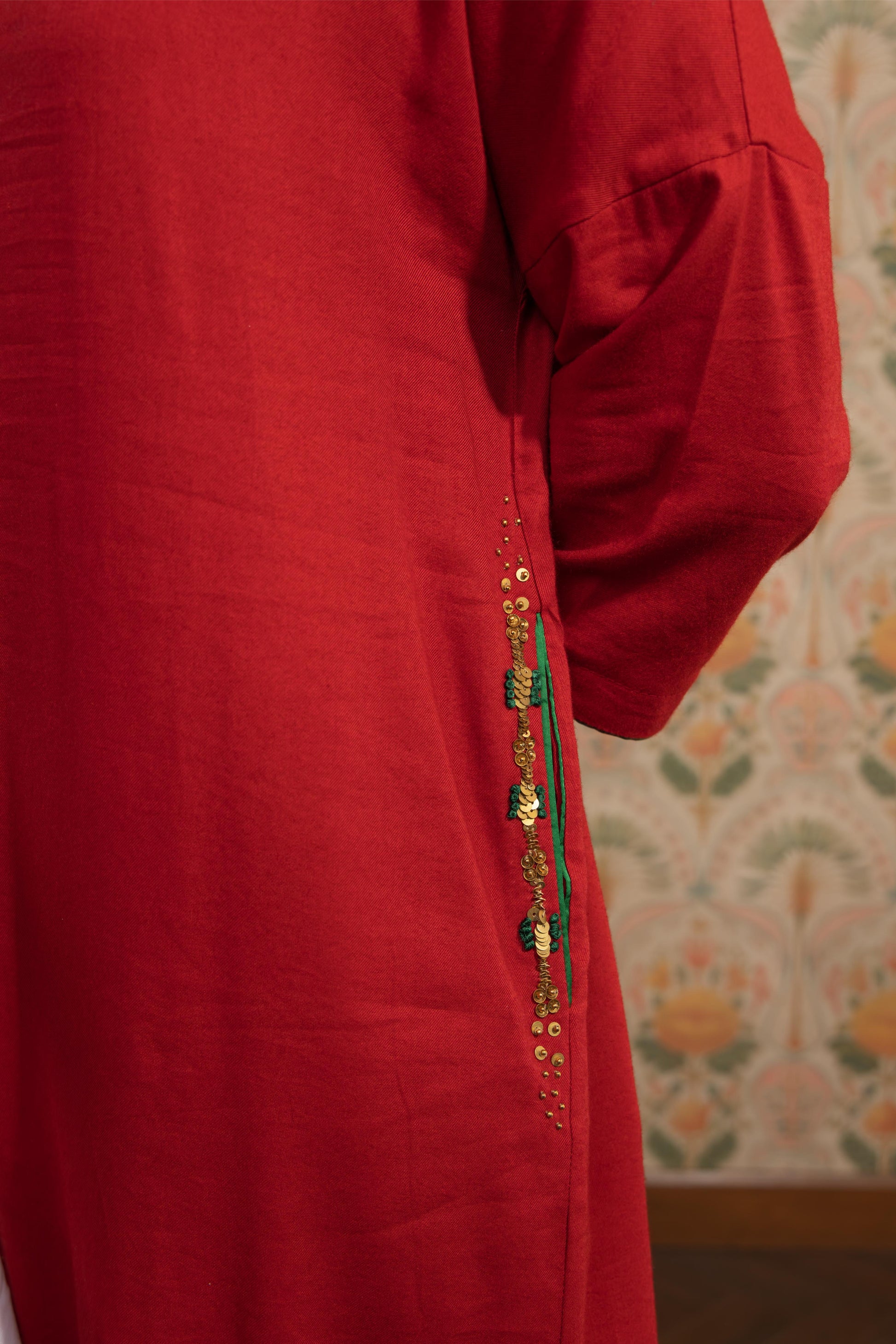 Elevate everyday dressing with this elegant co-ord set featuring subtle handcrafted detailing. The straight kurta comes with a round neckline, three-quarter sleeves, and a relaxed silhouette, enhanced with delicate hand embroidery work on the pocket. Paired with straight-fit trousers finished with hand embroidery at the bottom hem, this set blends minimal design with artisanal charm — making it suitable for casual wear, festive gatherings, or semi-formal occasions.