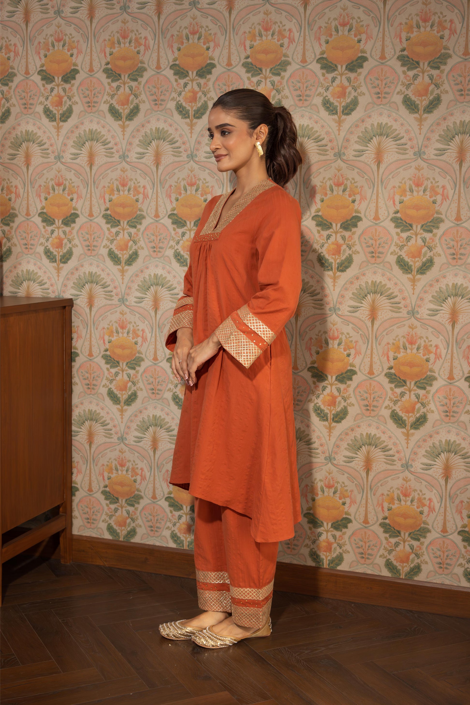 Embrace understated elegance with this graceful co-ord set. The kurta is designed with a deep V-neckline highlighted by intricate lace work, extending to the sleeve cuffs for a refined finish. An additional lace detail at the empire line adds a touch of delicacy to the overall look. Paired with straight-fit trousers featuring lace edging at the hem, this set blends timeless charm with modern sophistication, making it ideal for festive gatherings, evening outings, or formal occasions.